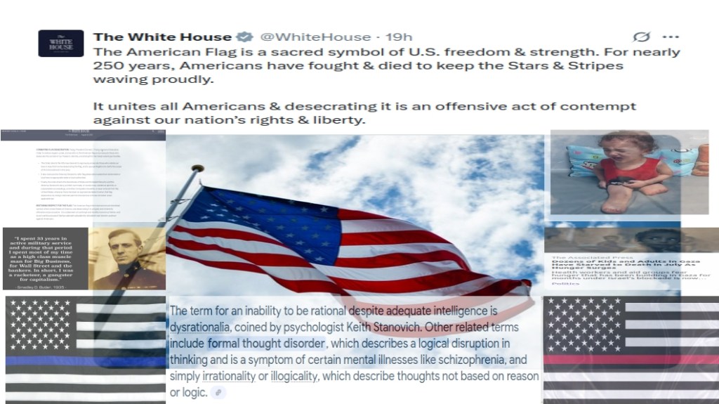 these are desecrations – the weaponization of We the Peoples “sacred” image, flag – akin to hasbara – akin to the mind control tactics of America’s inherent enemies THE MONARCHY and their INTERNATIONAL BANKING PARTNERS, IMPERIALISTSCOMBATING FLAG DESECRATION: Today, President Donald J. Trump signed an Executive Order to restore respect, pride, and sanctity to the American flag and prosecute those who desecrate this symbol of our freedom, identity, and strength to the fullest extent permissible.