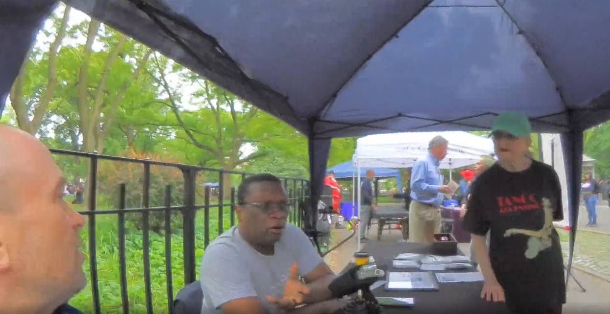 REGGIE of WBAI radio NYC TOMPKINS SQ PARK TENT AFTER THE DANCING PARADE HITTING the BRICKS 5-18-24